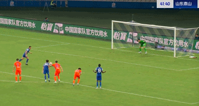 第41分钟,王大雷禁区内扑倒刘诚宇,主裁判判罚点球,吴曦主罚点球低射破门,2比1!